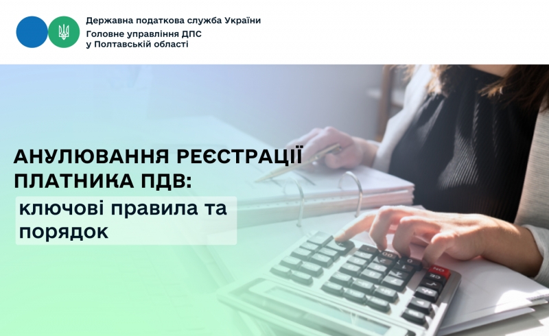 Головне управління ДПС у Полтавській області повідомляє, що анулювання реєстрації платника ПДВ відбувається у випадках, коли підприємство або ФОП більше не відповідають вимогам для перебування в реєстрі платників ПДВ, припиняють діяльність або переходять на спрощену систему оподаткування.