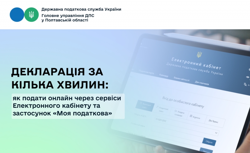 Головне управління ДПС у Полтавській області повідомляє, що подати Податкову декларацію про майновий стан і доходи можна буквально за кілька хвилин – без черг і паперової тяганини. Сервіси Електронного кабінету дозволяють заповнити та надіслати документ онлайн, частину даних система підтягує автоматично.