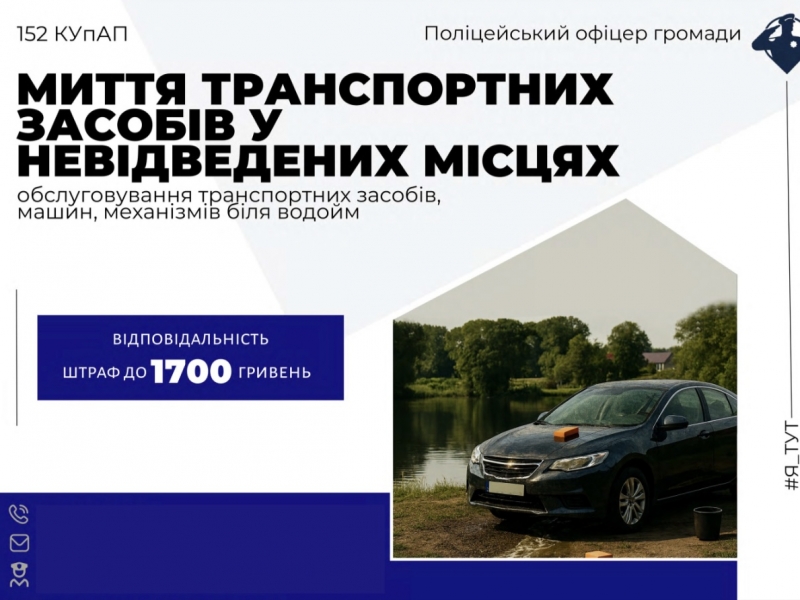 2)за миття транспортних засобів у невідведених місцях, обслуговування транспортних засобів, машин, механізмів біля водойм – штраф до 1700 грн;