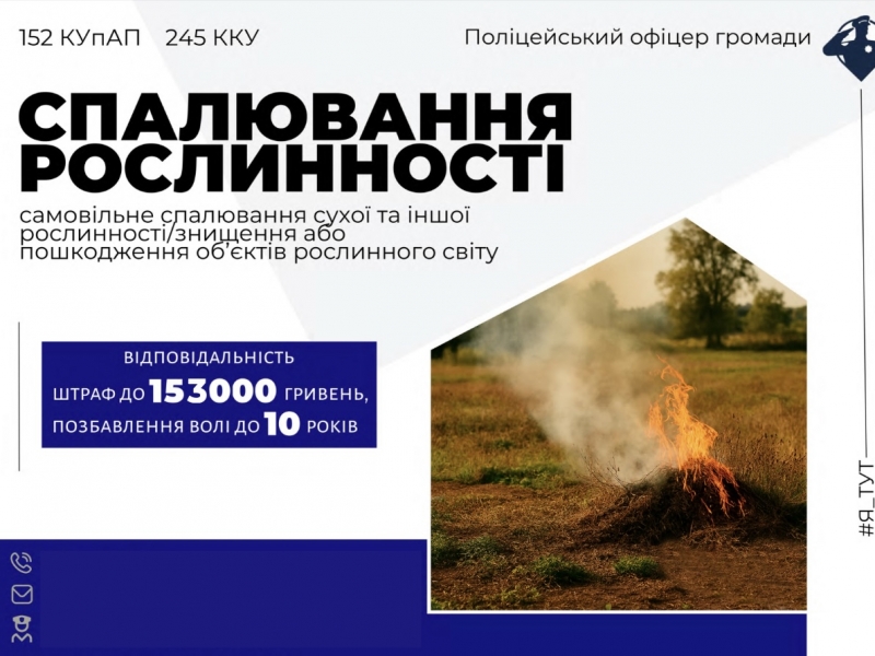 3)за самовільне спалювання сухої та іншої рослинності, знищення або пошкодження об’єктів рослинного світу – штраф до 153000 грн, позбавлення волі до 10 років;