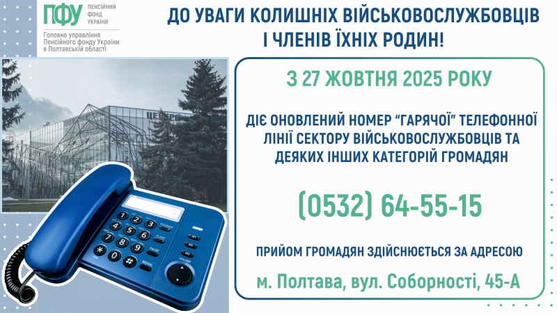З 27 жовтня 2025 року колишні військовослужбовці та члени їхніх сімей можуть отримати консультації з пенсійних та соціальних питань за новим контактним номером:
