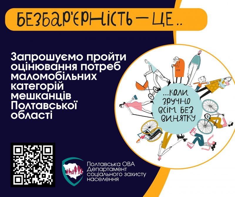 На виконання Плану заходів на 2025 рік з реалізації Національної стратегії із створення безбар’єрного простору в Україні на період до 2030 року, Департаментом соціального захисту населення облвійськадміністрації проводиться анкетування мешканців області, з числа маломобільних категорій населення щодо визначення їх потреб та бар'єрних аспектів при взаємодії з громадою, соціальною інфраструктурою тощо.