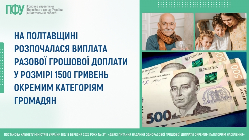 Вчора, 8 квітня, відповідно до урядового рішення від 18 березня 2026 року в області розпочалася виплата одноразової грошової доплати в розмірі 1500 грн окремим категоріям громадян. У квітні додаткову адресну допомогу одержать на Полтавщині близько 600 тисяч осіб.