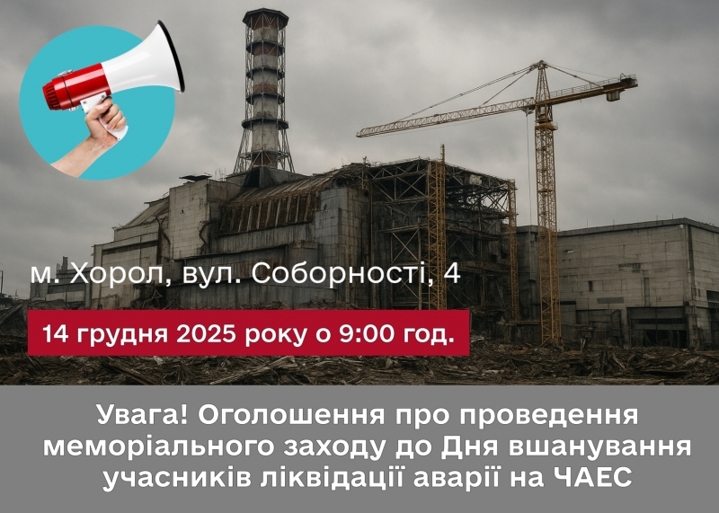 До уваги учасників ліквідації аварії на ЧАЕС Хорольської міської територіальної громади! Запрошуємо вас взяти участь у покладанні квітів з нагоди 39-х роковин до Дня вшанування учасників аварії на Чорнобильській АЕС. Меморіальний захід відбудеться у неділю, 14 грудня о 09:00 годині у середмісті Хорола, біля пам’ятної стели та пам’ятного знаку рятівникам-ліквідаторам Хорольщини (після участі у мирній акції нагадування про загальнонаціональну хвилину мовчання "Зупинись! Вшануй!" на центральній площі міста).