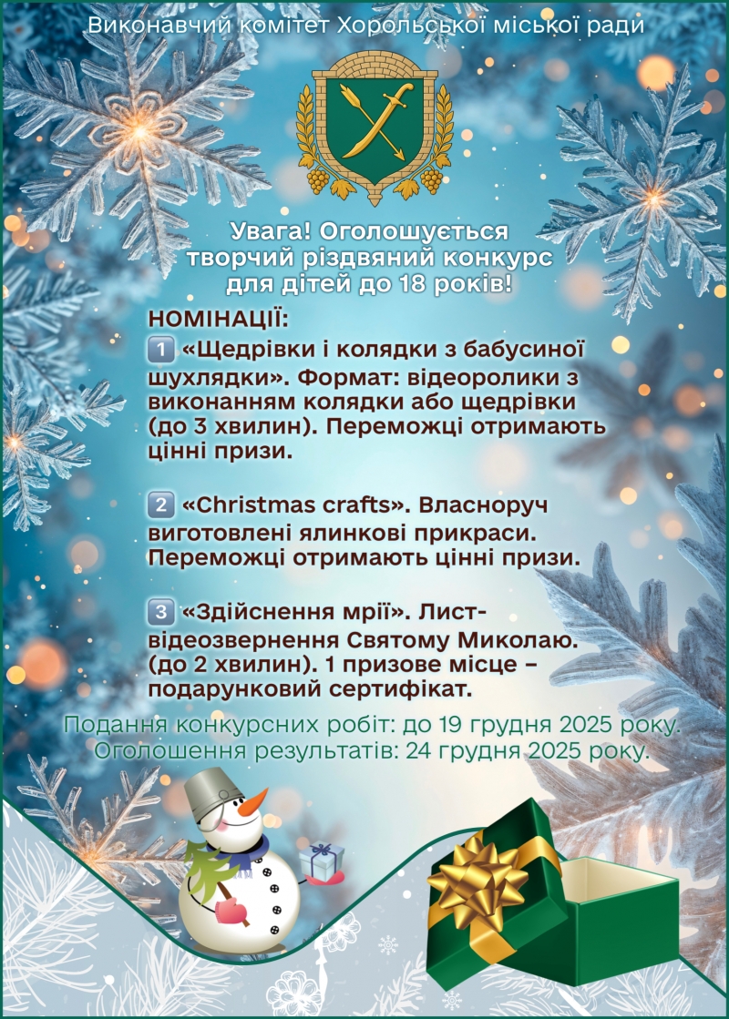 Різдво – це час тепла, родинності та маленьких див. У ці дні кожен з нас чекає на світло, що приходить у серце, на чарівні миті, які об’єднують сім’ї, та на мрії, що мають силу збуватися. Саме тому ми хочемо подарувати дітям нашої громади можливість творити, мріяти й ділитися своїм талантом. Запрошуємо юних мешканців взяти участь у святковому конкурсі, що проходитиме у трьох номінаціях: