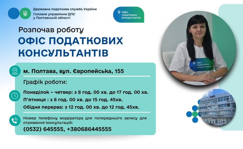 У Головному управлінні ДПС у Полтавській області з 08.09.2025 успішно функціонує «Офіс податкових консультантів», розташований у приміщення Центру обслуговування платників Полтавської ДПІ Головного управління ДПС у Полтавській області за адресою: м. Полтава, вул. Європейська, буд. 155. До складу робочої групи «Офісу податкових консультантів» входять 47 фахівців майже з усіх структурних підрозділів. Консультанти Офісу допомагають і надають практичну допомогу з різних питань: оподаткування фізичних та юридичних осіб; електронні сервіси та звітність; податкові спори; фактичні перевірки та законодавство щодо РРО/ПРРО; контроль за обігом підакцизних товарів; зупинення реєстрації ПН / РК; погашення податкового боргу та заборгованості з ЄСВ; надання кваліфікованих електронних довірчих послуг; трансфертне ціноутворення та інші.