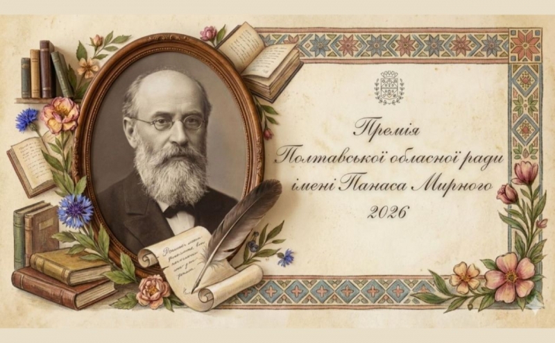 Оголошується прийом матеріалів на здобуття Премії Полтавської обласної ради імені Панаса Мирного 2026 року. Премія Полтавської обласної ради імені Панаса Мирного заснована з метою відзначення громадян за визначні досягнення у галузях літератури, літературознавства, музики, живопису, архітектури, народної творчості, журналістики та публіцистики – за кращі творчі здобутки, що утверджують гуманістичні та національні ідеали, духовні цінності українського народу й є вагомим внеском у національно-культурне відродження Української держави.