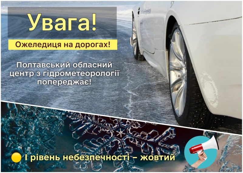 За інформацією Полтавського обласного центру з гідрометеорології, у нічний час та в першій половині дня 29 січня 2026 року по м. Полтава та на території Полтавської області очікується туман із видимістю 200-500 метрів. На автошляхах – ожеледиця, що значно ускладнює рух транспорту та підвищує ризик дорожньо-транспортних пригод.