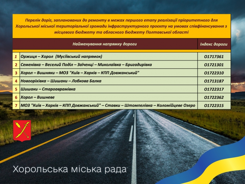 Запланований ремонт доріг в межах першого етапу реалізації пріоритетного для Хорольської міської ТГ інфраструктурного проєкту виконано в повному обсязі. Хорольській міській раді, як місцевому органу управління, цьогоріч вдалося частково вирішити проблему пошкоджених ділянок доріг в межах наявних фінансових ресурсів із залученням коштів обласного бюджету Полтавської області.