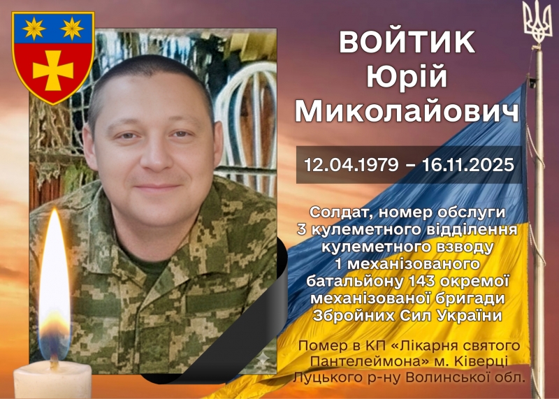 Опускається на землю тиха зажура, і немов приглушує світ чорна скорбота, бо відійшов у вічність ще один мужній син України – наш земляк із Вишняківського старостату Войтик Юрій Миколайович. Чесна й добра людина, Воїн світла, пройшов крізь горнило війни, отримав поранення і довгий час боровся за життя, але не вистояв.