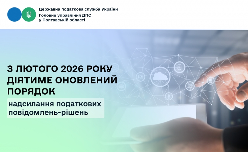Головне управління ДПС у Полтавській області інформує, що з 26 лютого 2026 року в Україні застосовуватиметься оновлений порядок надсилання податкових повідомлень – рішень (ППР). Відповідні зміни затверджені наказом Міністерства фінансів України від 09.10.2025 № 513, яким внесено зміни до Порядку надсилання контролюючими органами податкових повідомлень-рішень платникам податків.