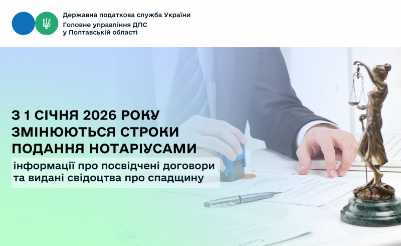 Головне управління ДПС у Полтавській області інформує, що з 1 січня 2026 року про посвідчені договори та видані свідоцтва про спадщину приватні нотаріуси звітуватимуть щоквартально (з деталізацією по місяцях звітного кварталу), а державні – щомісячно.