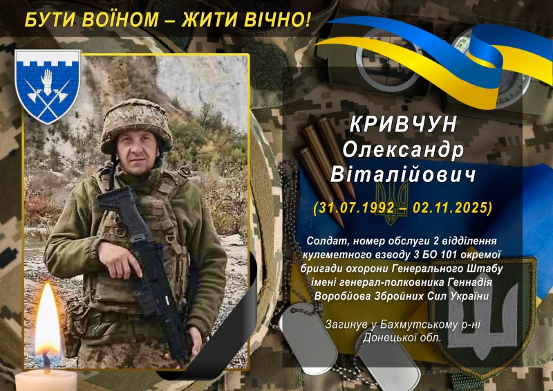 Увага! Траурна церемонія прощання із полеглим Героєм Олександром Кривчуном відбудеться 12 листопада 2025 року о 10:00 год. на площі біля пам’ятника Великому Кобзарю в м.Хорол, а чин поховання – на цвинтарі в с.Мала Попівка Новоаврамівського старостату.